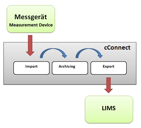 Umwandlung der Daten ( mit oder ohne zwischengeschaltete Berechnung) in ein vom LIMS lesbares Format und Übermittlung in ein Eingangsverzeichnis zur Übernahme durch das LIMS